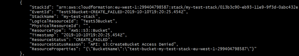 You can see here that we have a resource status CREATE_FAILED, with the reason that access was denied to s3:CreateBucket. This is fair enough, considering our cloudformation-user doesn't have this permission. At this point we have 2 options: