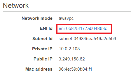 This opens up details of the Elastic Network Interface (ENI) which our ECS task uses to connect to the network and internet. Under Zone it tells us which availability zone this ENI and associated ECS task are in.
