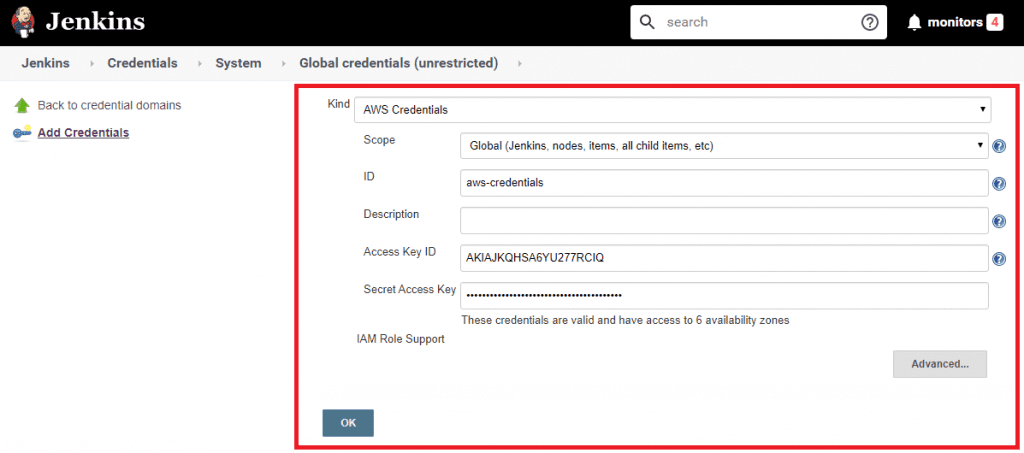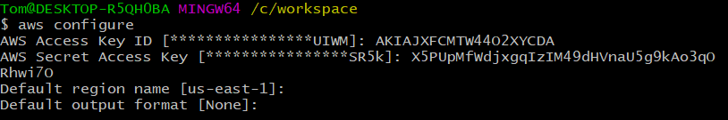 - enter your Access Key ID and Secret Access Key that you setup in the prerequisites section