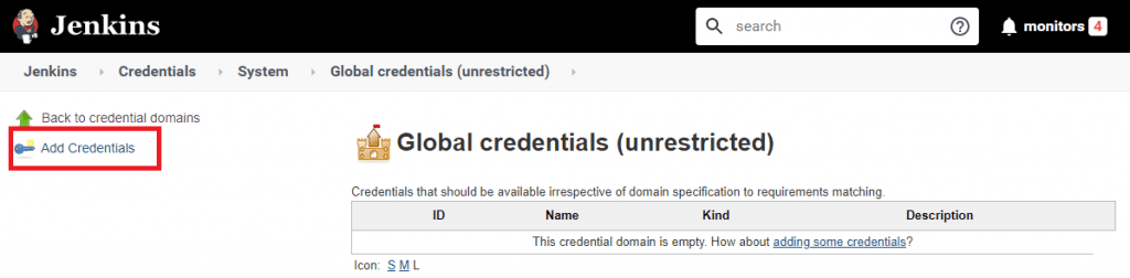 Click on Manage Jenkins in the left hand navigation, then Manage Credentials. Click on the Jenkins scope, then Global credentials. Click Add Credentials on the left-hand side: