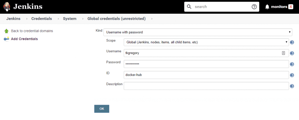 Since our pipeline also includes a stage to deploy to Docker Hub, you'll also need to add a Username with password type credential with your Docker Hub login details. See part 2 for full details on settings this up.