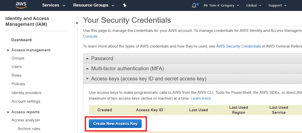 You'll also need an AWS access key and secret key. You can generate this by clicking on your name in the top bar, then clicking on My Security Credentials > _Access key_s. Then select Create New Access Key: