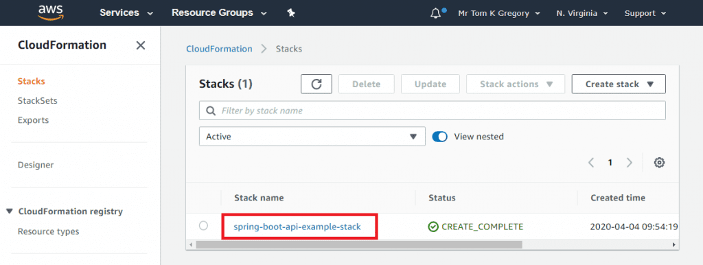 Over in the AWS Console, navigate to Services > CloudFormation > Stacks and you'll see our spring-boot-api-example stack: