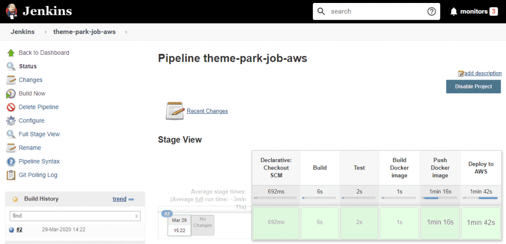 Importantly, we now have a theme-park-job-aws job. This references the Jenkinsfile-aws in the Spring Boot API project.