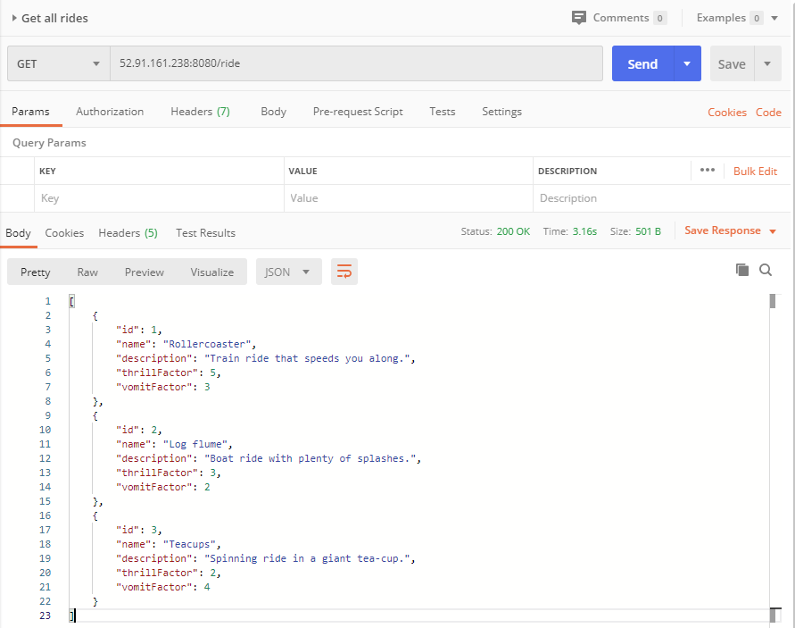 Let's fire up Postman again and make a GET request to our service running in AWS, substituting in the public IP in the format http://\<public-ip\>:8080/ride: