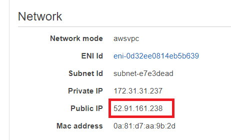 On the page that follows there's lots of information about our task, but importantly for us under the network section we have a public IP:
