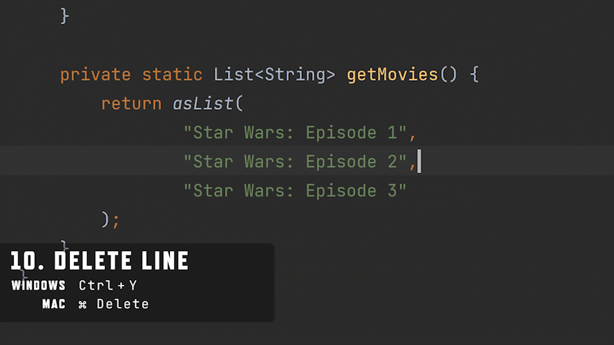 | 10. Delete line | Ctrl + Y | ⌘ Delete |
