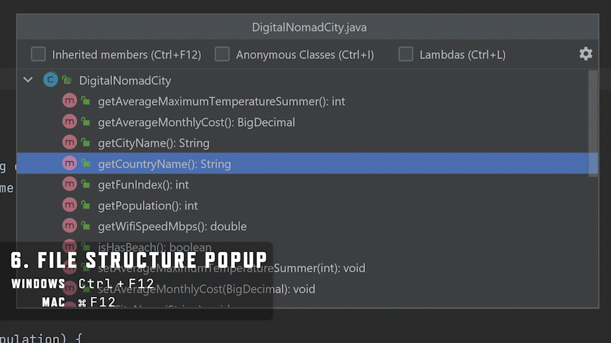| 6. File structure popup | Ctrl + F12 | ⌘ F12 |