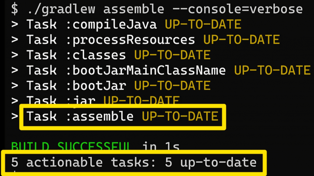 }Let's run assemble, and we see that Gradle runs bootJar first to generate the special Spring Boot fat jar file.