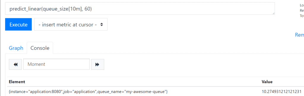 This example shows us the prediction of the queue size 1 minute from now, based on the last 10 minutes of data.