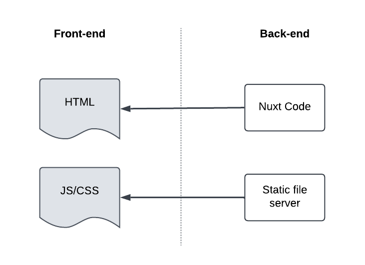 When you request a Nuxt application in the browser, such as https://nuxt.tomgregory.com/, you call a backend service that returns an HTML response. The browser renders that HTML, which requests static files such as JavaScript and CSS from URLs beginning https://nuxt.tomgregory.com/_nuxt/.