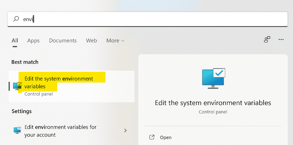 Now press Start, type Environment, and select Edit the system environment variables.