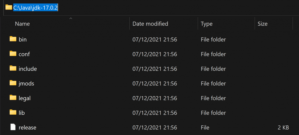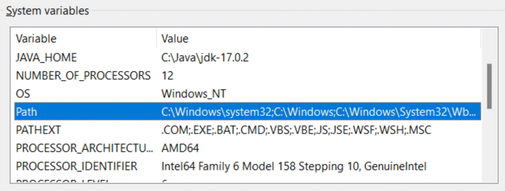 It includes an entry for C:\Java\jdk-17.0.2\bin, my JDK installation. In fact, it points to the bin directory containing Java programs such as: