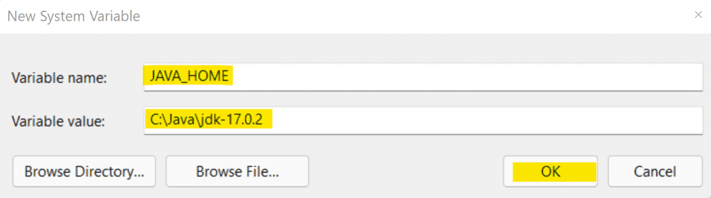In the dialog that appears, set a Variable name of JAVA_HOME and for Variable value paste the JDK directory location you copied earlier.