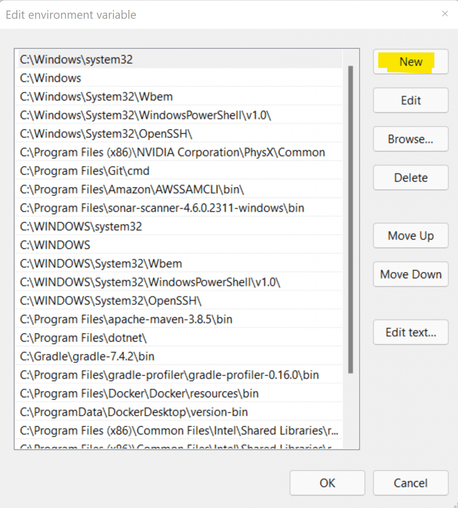Double click Path and it will bring up a list of all the directories contained in the variable. We need to add a new entry so hit New.