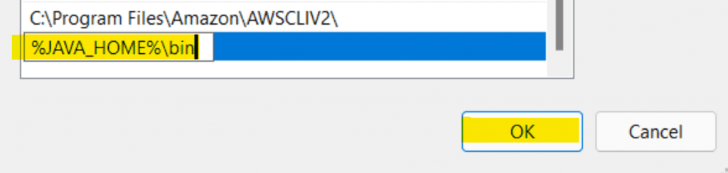 You'll end up in a text box where you should enter the value %JAVA_HOME%\bin. This references the JAVA_HOME variable so we don't repeat the same information twice.
