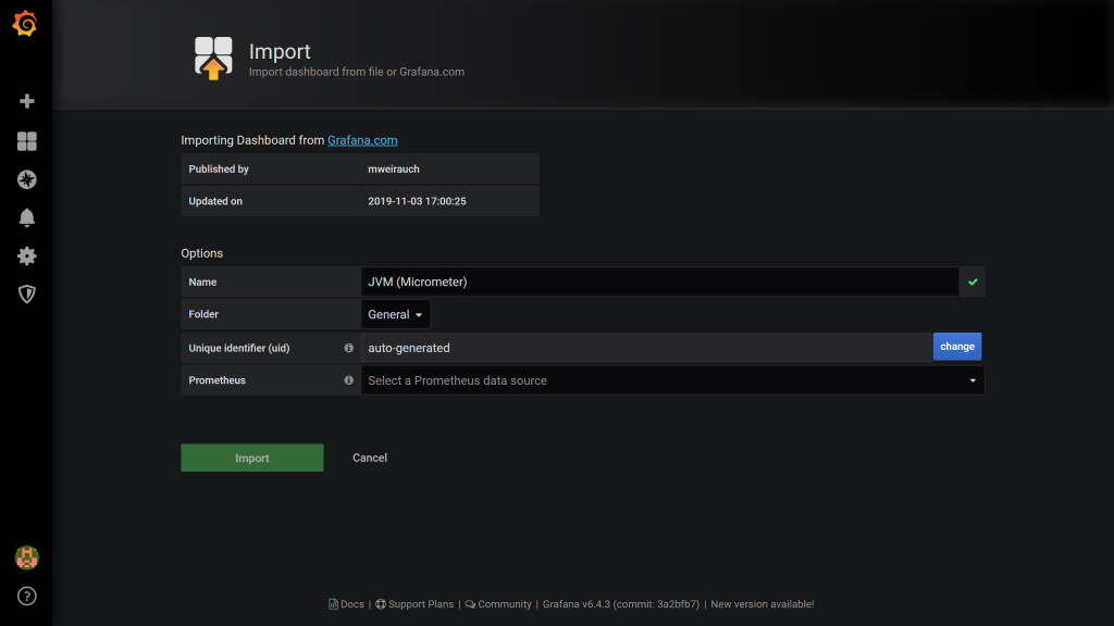 To import this dashboard, go to Create (plus icon) > Import. Where it says Grafana.com dashboard, paste in 4701, which is the id of this dashboard. You'll see a screen like this: