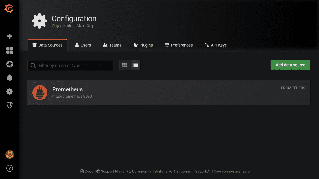 If you navigate to Configuration (cog icon) > Data Sources, you'll see the Prometheus datasource we just setup: