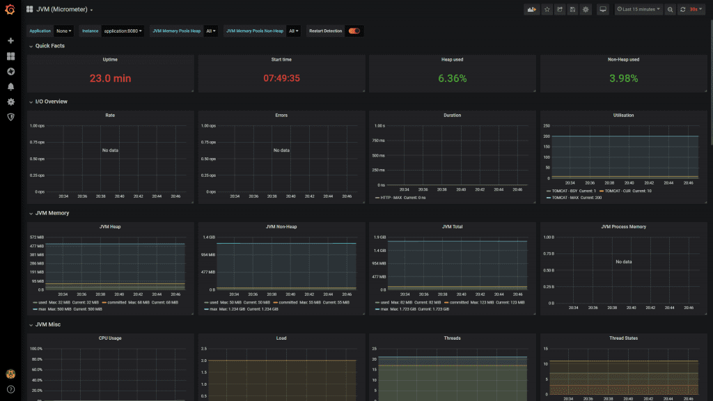 Once you've setup metrics for your application, and can query them and alert from them, when something goes wrong you need somewhere to go to quickly get a visual overview of what's happening. In this article, you'll discover how to setup a basic dashboard with Grafana, showing useful graphs to summarise the current state of a Spring Boot application.