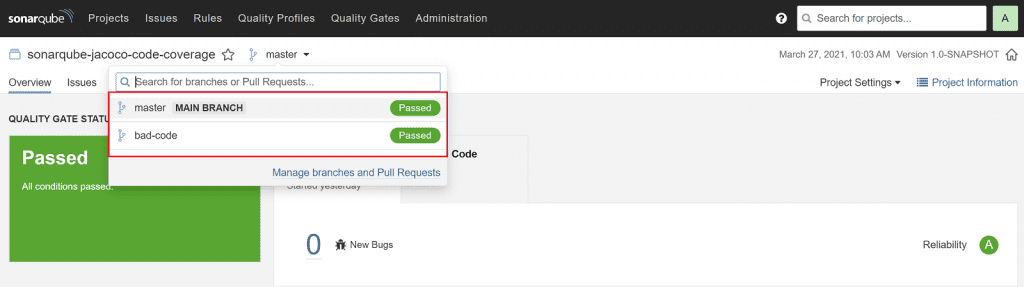 We're going to use the sonarqube-jacoco-code-coverage GitHub repository which is already setup with the two branches mentioned earlier. Clone the repository locally: