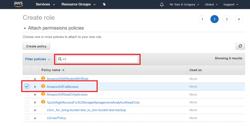 Now we can select what permissions to provide the role. Search for s3, select AmazonS3FullAccess, then click Next.