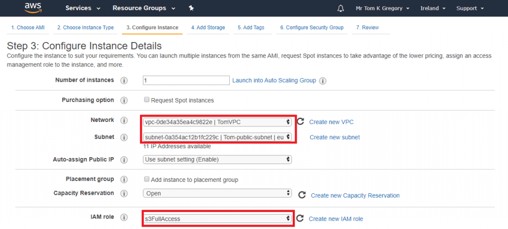 - On the Configure Instance Details page, select the private subnet in your VPC (as well as the s3FullAccess role)