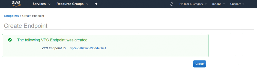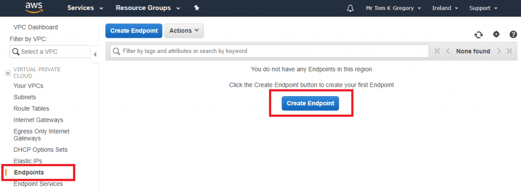 Navigate to Services > VPC > Endpoints, and select the tempting big blue Create Endpoint button:
