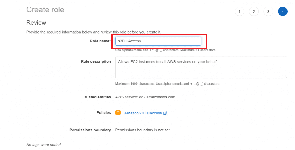 Skip over the tags page by also clicking Next. Give the role a name such as s3FullAccess then click Create role.