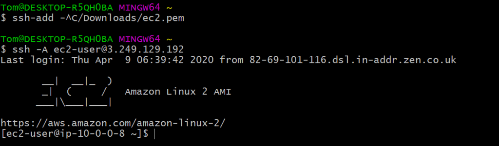 First, don't forget to add your key using ssh-add. Then we'll execute ssh -A on the instance: