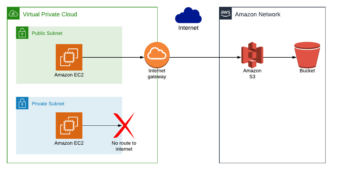 - Our instance is in a private subnet with no route to the internet, so the AWS CLI can't establish a connection to the S3 service