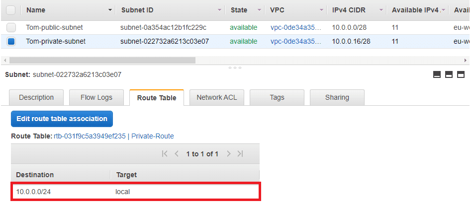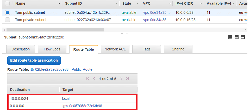We need a public subnet into which we're going to deploy an EC2 instance. Below we can see this subnet has a route to an internet gateway.