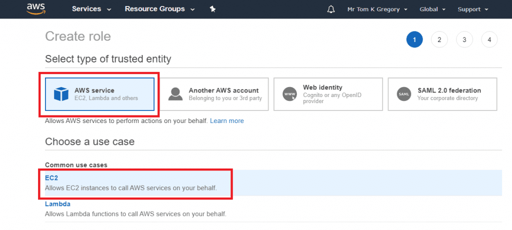 Select what service this role should apply to, by selecting AWS service and the EC2, then click Next: