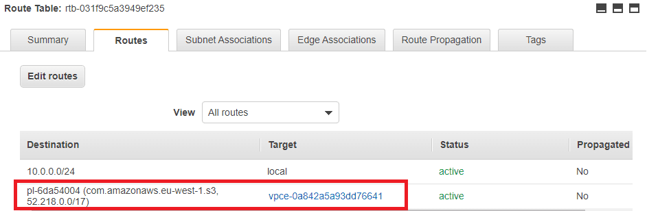 The image below shows a route table which has the S3 endpoint included. We have a route for requests with a destination s3.eu-west-1.amazonaws.com to target the VPC endpoint. Therefore any S3 requests will be routed through to S3.