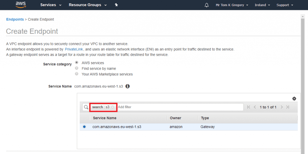 Now we have to tell AWS what type of endpoint we want to create. Search for s3, and select the com.amazonaws.<region>.s3 Service Name: