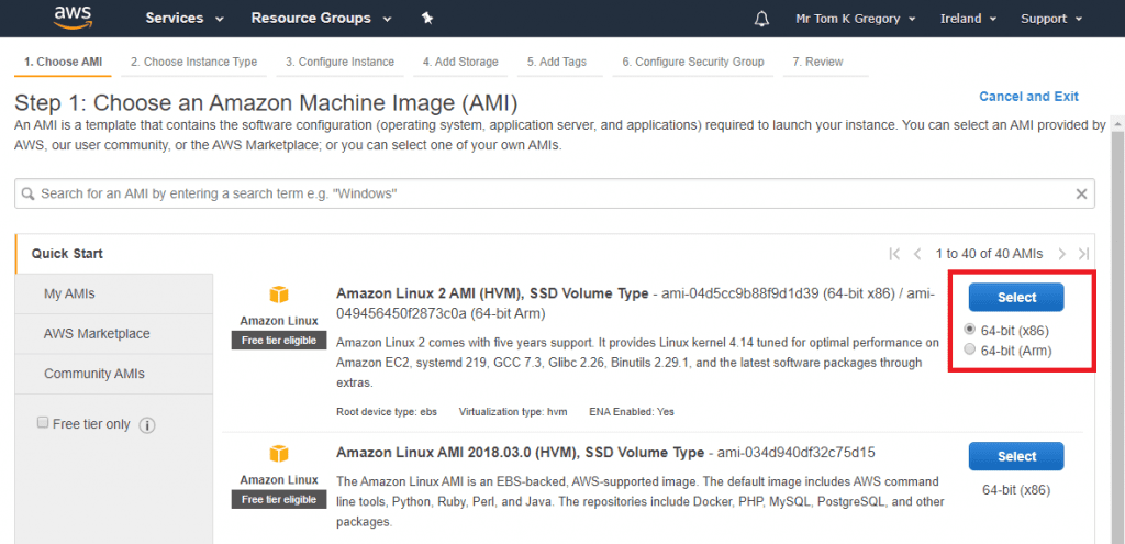 Go to Services > EC2 and click the Launch instance button. Select an Amazon Machine Image (AMI) to use, such as Amazon Linux 2 AMI (HVM), SSD Volume Type, then click Select.