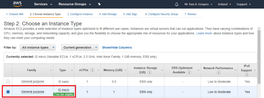 Since we need very little compute power, choose t2.micro, then click Next: